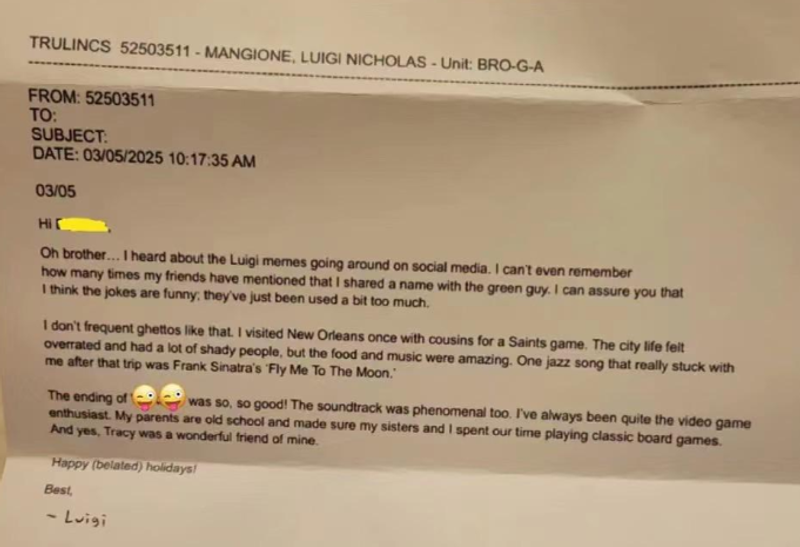 Luigi's legal team is aware of at least one AI handwriting generator and several forged letters claiming to be from Luigi via TRULINCS. Here is an example of one such forged letter:
