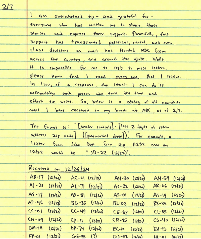 "I am overwhelmed by - and grateful for - everyone who has written me to share their stories and express their support. Powerfully, this support has transcended political, racial, and even class divisions, as mail has flooded MDC from across the country, and around the globe. While it is impossible for me to reply to most letters, please know that I read every one that I receive. Thank you again to everyone who took the time to write. I look forward to hearing more in the future." -Luigi Mangione
